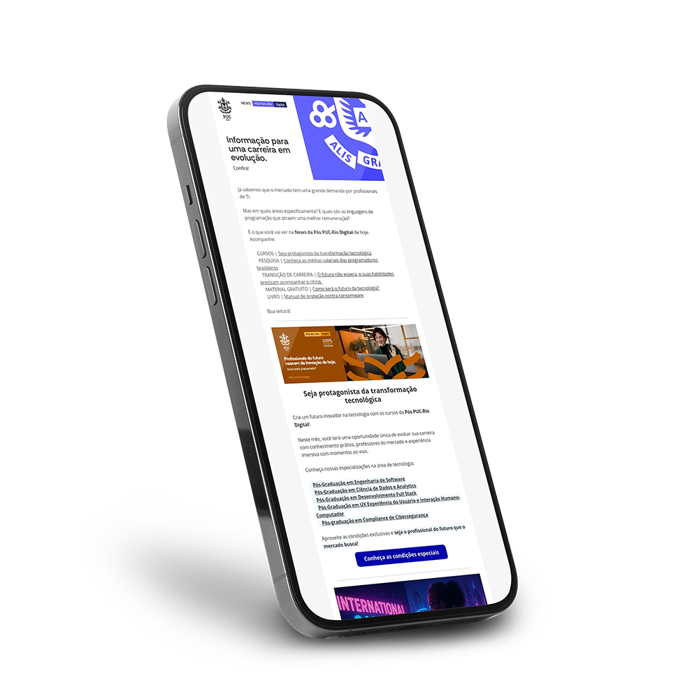 Você pode se inscrever na newsletter da PUC-Rio Digital. Ela entrega, diretamente na sua caixa de entrada, conteúdos sobre o mercado de trabalhos e os tópicos mais relevantes para as áreas de Economia Criativa, Direito, Tecnologia e Engenharia.
